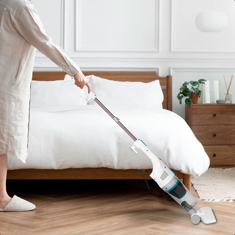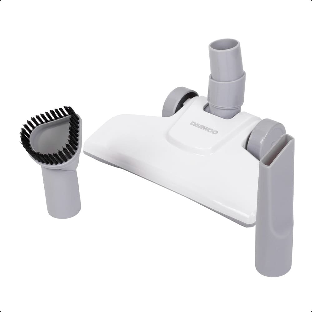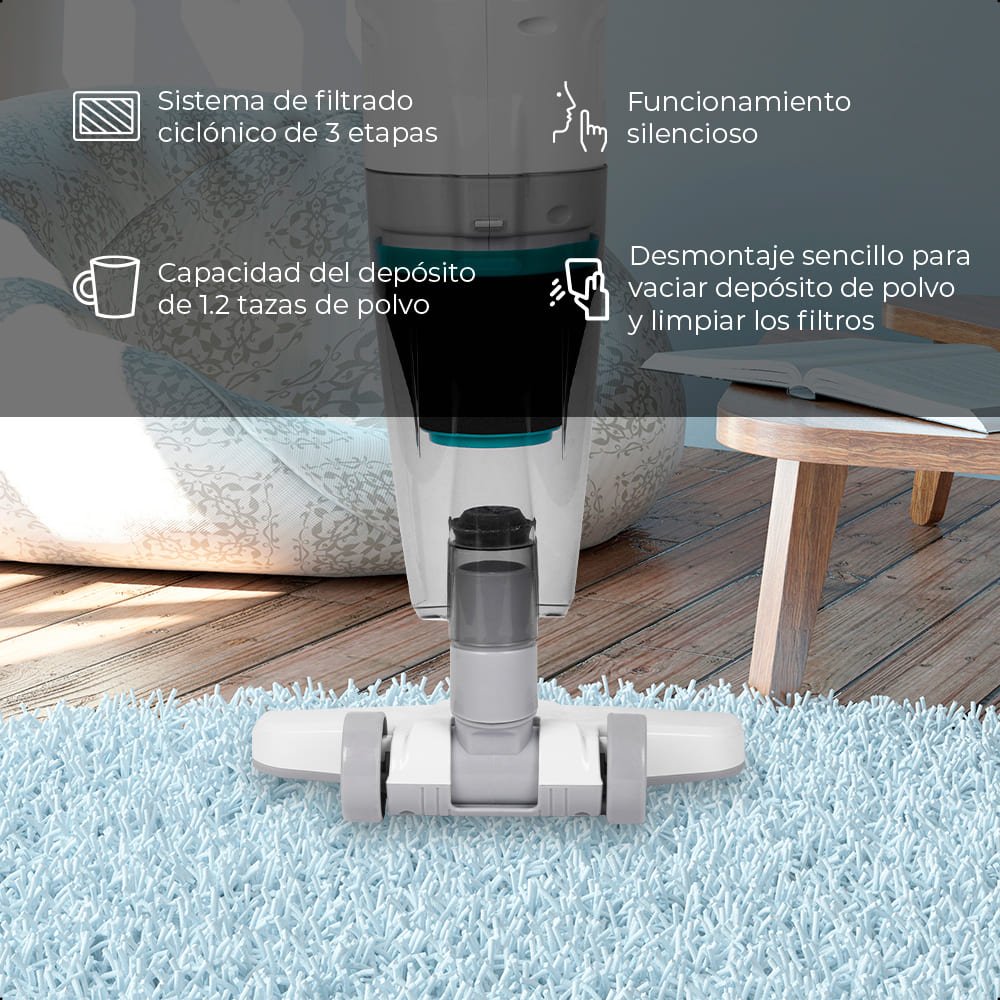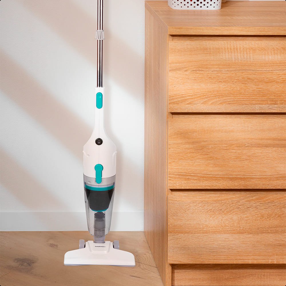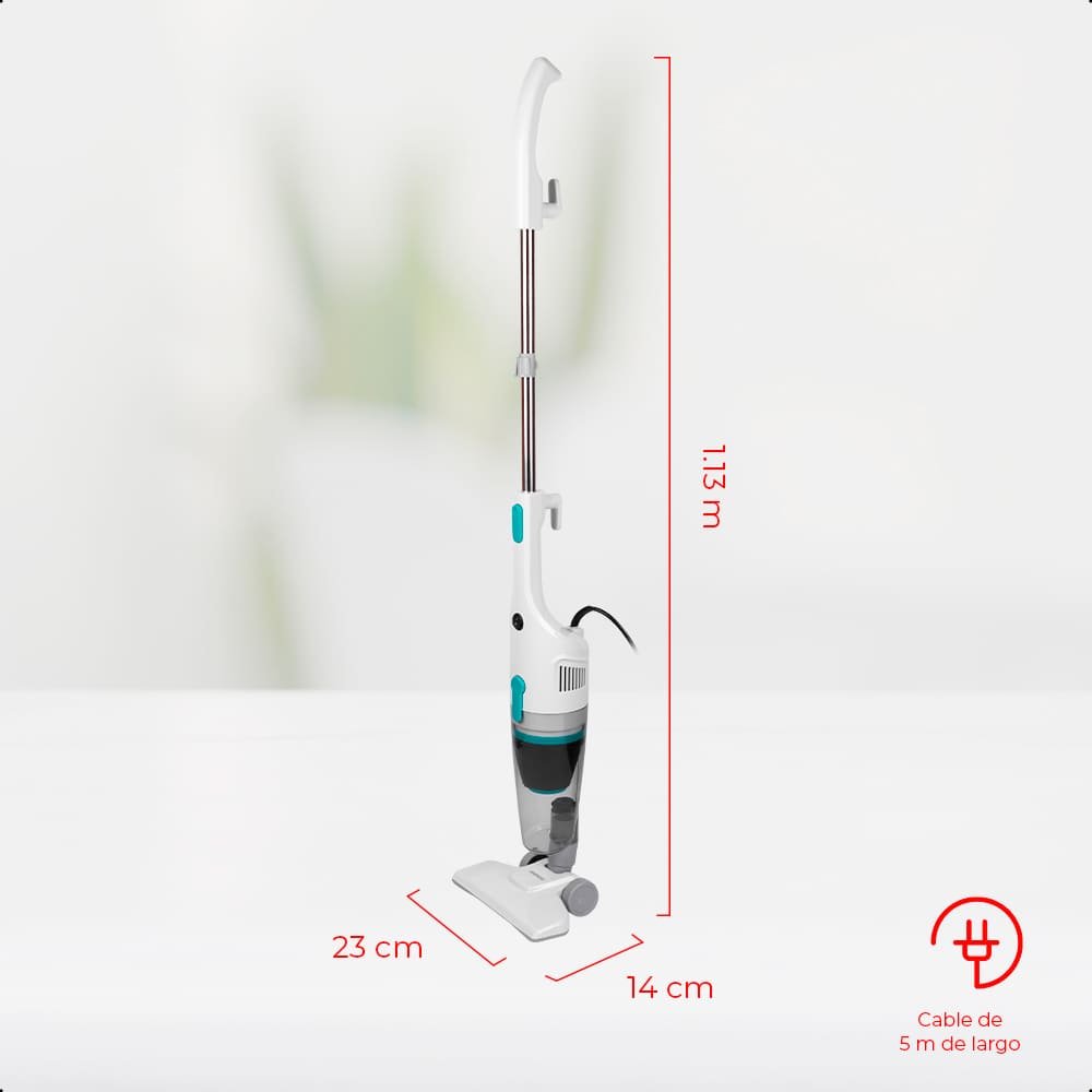Aspiradora de mano Daewoo®, la forma más fácil de limpiar tu hogar. Dile adiós a los grandes armatostes de aspiradoras y, en su lugar, comienza a usar una alternativas más cómoda. Diseñada para usarla con una sola mano y ocupar el menor espacio posible, esta aspiradora te ayudará a limpiar tu hogar del polvo, suciedad y más. Su potente motor ofrece más potencia de succión y, eso no es todo, también cuenta con un sistema de filtrado ciclónico de tres etapas. Esto significa que cuando la utilices, el aire que salga de la aspiradora tendrá una mejor calidad, ya que retiene las partículas de polvo. Además, su cable de 5 m te ayudará a moverte libremente y brindará aspiración continua. Lo mejor de todo es que cuenta con accesorios intercambiables para aspirar esquinas y espacios difíciles de alcanzar.Diseño compacto para usarla con un manoSistema de filtrado ciclónico de tres etapasSencillo sistema de desmontaje para vaciar fácilmente el depósito y filtrosDepósito de 1.2 tazas de polvoGran potencia de succiónMás silenciosaNivel de ruido: ≤ 78 dBAspiración: ≥ 16 kpa127V~60Hz, 600WAccesorios intercambiables: 1 boquilla para hendiduras,1 cepillo para sofá y 1 cepillo de pisoUsar de acuerdo al manual de usuarioColor blanco con turquesaHecha con ABSMedidas: 14 cm de ancho, 23 cm de largo y 1.13 m de alto