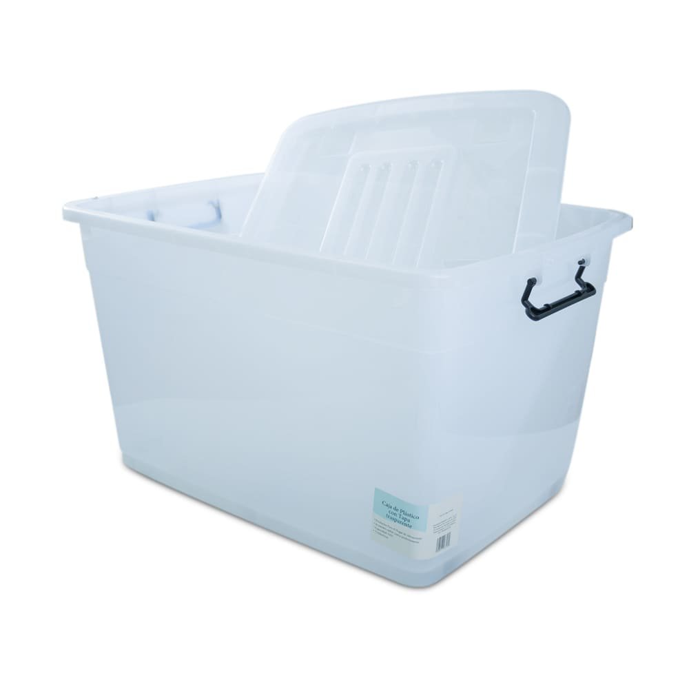 Caja de plástico, el lugar ideal para almacenar cada colección y objeto en tu hogar. Las cajas son uno de los artículos más útiles en cuestión de organización, especialmente cuando se trata de mudanzas o simplemente para convertir el caos de una habitación en un lugar bien ordenado. Esta caja de plástico te ayudará a encontrar un lugar para esos cachivaches que tienes en tu hogar. Tiene un diseño transparente que te permitirá ver su contenido con tan solo un vistazo, además, puedes sellar la tapa girando las asas laterales hacia arriba, esto evitará que se abra por accidente. Como un extra para añadir funcionalidad y sea más fácil transportarla, tiene pequeñas ruedas en la parte inferior, así se deslizará en el piso sin esfuerzo.Caja de plástico con ruedas y tapaTransparenteFija la tapa girando las asas hacia arribaRuedas en la parte inferiorAsas que te facilitarán cargarlaApilableLimpiar con un paño húmedoMedidas: 77 cm de ancho, 56 cm de largo y 45 cm de alto