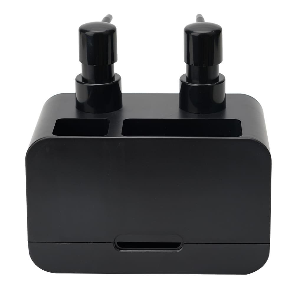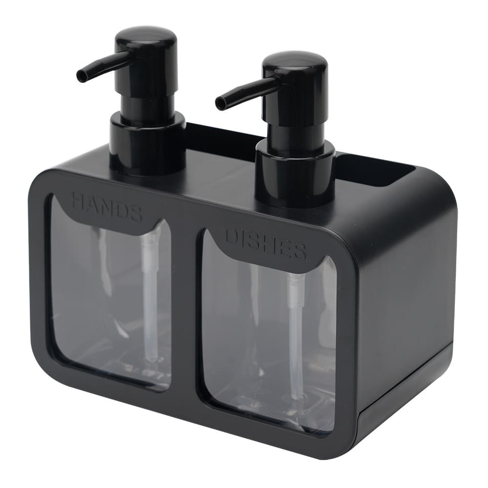 Dispensador de jabón doble, más jabón en un solo lugar. Tus manos agradecerán que las laves con un jabón diferente al que usas para los trastes. Coloca este dispensador en tu fregadero y tendrás a tu disposición más de un tipo de jabón, uno para trastes y otro para tus manos. Cuenta con dos recipientes separados, solo da un pequeño apretón a las boquillas para extraer el contenido. Además, en la parte de atrás, hay dos compartimientos donde puedes colocar diversos accesorios como esponjas, cepillos y más. Cuida tus manos incluso después de lavar los trastes con este dispensador.Ten a tu alcance jabón de manos y para trastes en un solo lugarCompartimiento para esponjas y accesoriosEvita que el agua goteeLa bandeja filtrante se puede quitar y poner para lavarla fácilmenteABS/acero inoxidable/polipropilenoMedidas: 10.2 cm de ancho, 18 cm de largo y 17.2 cm de alto