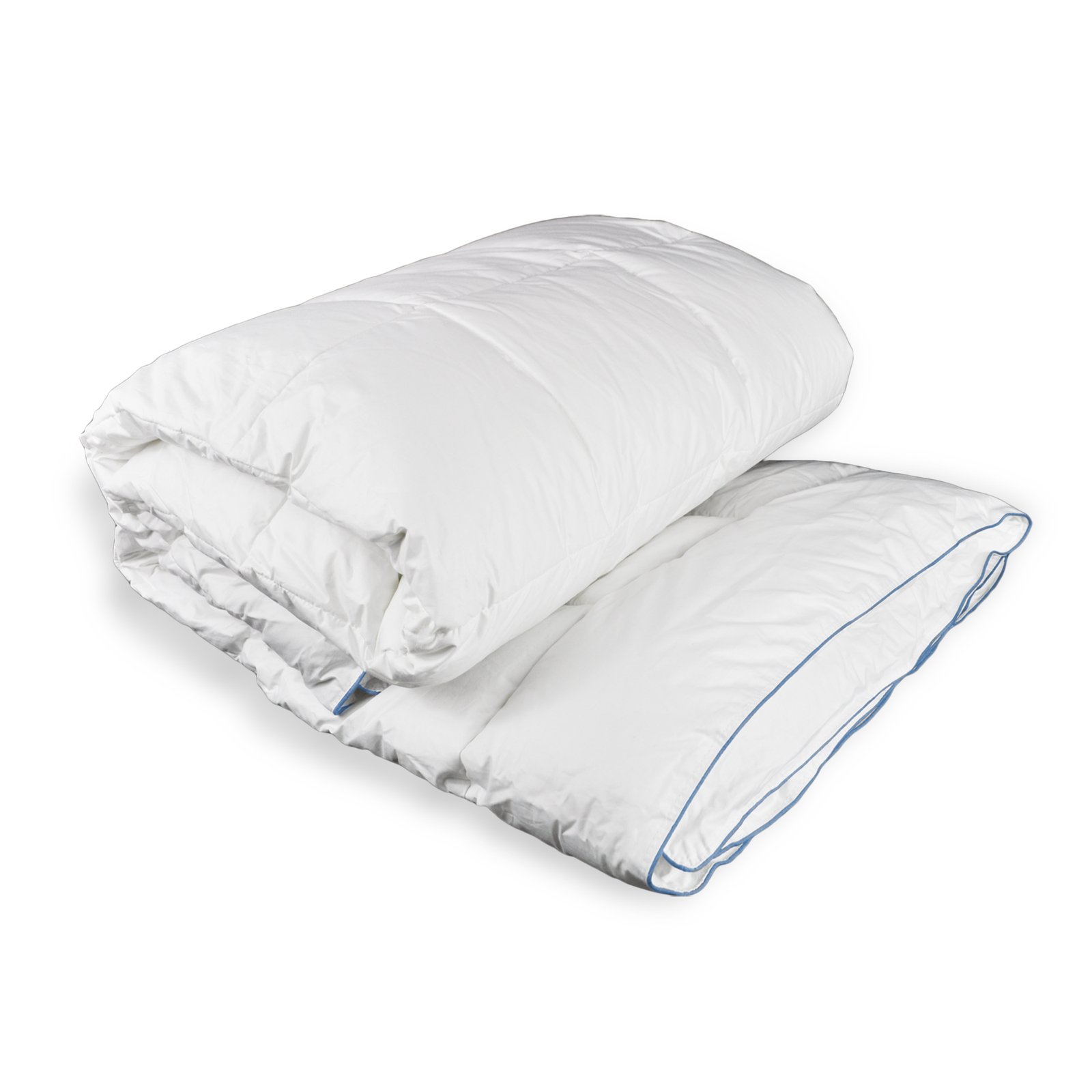 Con capitonado tipo napa por sus fibras entrelazadas, este edredón está diseñado para asegurar una sensación única que se amolda a tu cuerpo adaptándose térmicamente y permitiendo el paso del aire, es ideal para temporadas de verano. Está relleno de pluma de pecho de ganso, (fibra sintética 10 veces más delgada que un cabello humano) ultra liviano con un fino terminado con bies satinado azul y doble costura.