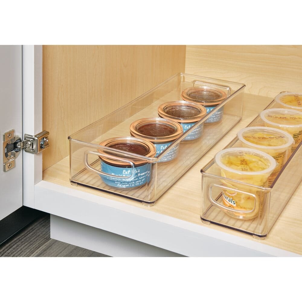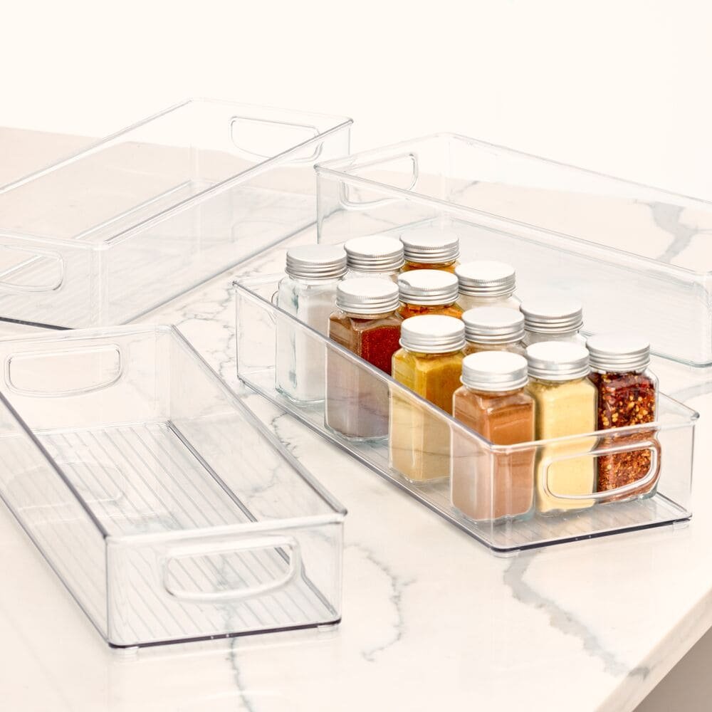 Organizador de plástico iDesign®, una forma práctica de ordenar tu espacio culinario. La cocina es uno de los lugares que tiene más cosas y, por consiguiente, aquí se necesita prestar mayor atención a la organización. Ya sea que necesites un espacio para frascos, botellas, condimentos y más, este recipiente hecho de plástico es tu mejor opción. Es resistente y duradero, además, su diseño es transparente, de esta forma podrás ver su contenido fácilmente.Diseño transparenteAsas para cargarlo fácilmenteIdeal para botellas, condimentos, frascos y másMedidas: 16 cm de ancho, 6 cm de largo y 3 cm de alto