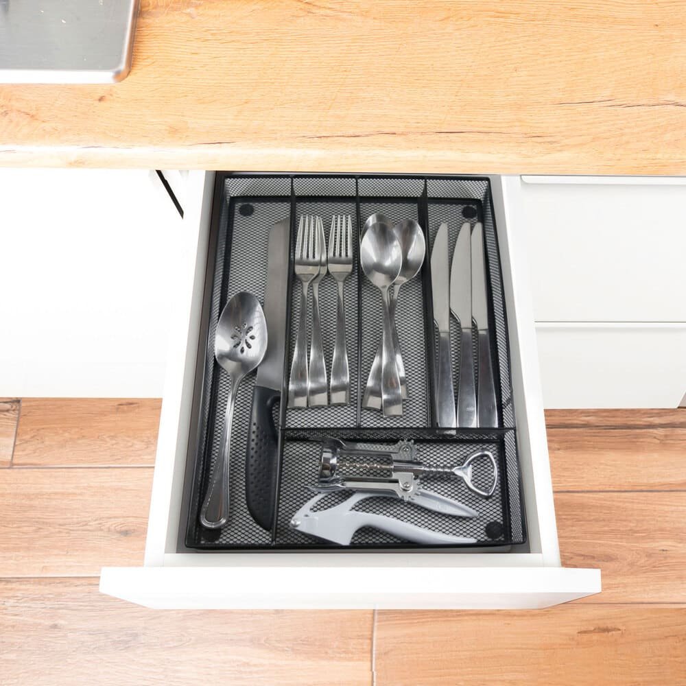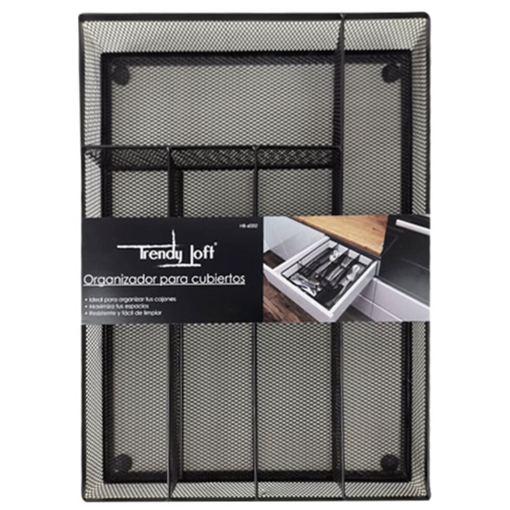 Organizador para cubiertos Trendy Loft® que es perfecto para poder tener tus cucharas, tenedores, cuchillos y demás cubiertos en orden y optimizando los espacios de los cajones de tu cocina al máximo. Este organizador se expande por lo cual podrás colocar en diferentes tipos de tamaños de cajones y así personalizarlo y usar al cien su capacidad. Cuenta con 5 compartimentos que podrás usar a tu gusto ya que son espaciosos. Trendy Loft® cuenta con diferentes tipos de organizadores de cocina (de venta por separado).Metal5 compartimentosBase antideslizanteDiseño en reja que evita la acumulación de humedadPeso: 2.1 kgLimpiar con un paño