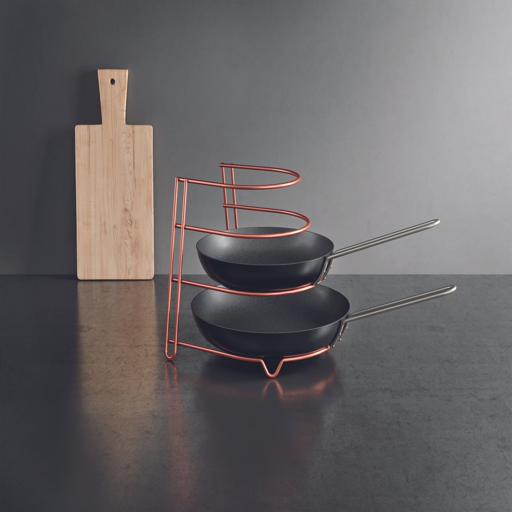 Organizador para sartenes Metaltex® que cuenta con 4 espacios para poder colocar y organizar sartenes de 20 hasta 32 cm y así tener tus espacios de alacena, gabinetes o cajones más optimizados. Además, este organizador añade estética a todos los espacios, cuenta con un recubrimiento que ayuda a que este no se oxide y con facilidad. Cambia la forma en la que organizas tus espacios y dale un toque elegante y único a tu cocina con este hermoso organizador de sartenes.Alambre plastificado4 espacios para sartenesRecubrimiento polythermPeso: 550 gMedidas: 27 cm de largo, 23 cm de ancho y 23 cm de altoLimpiar con un paño seco