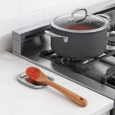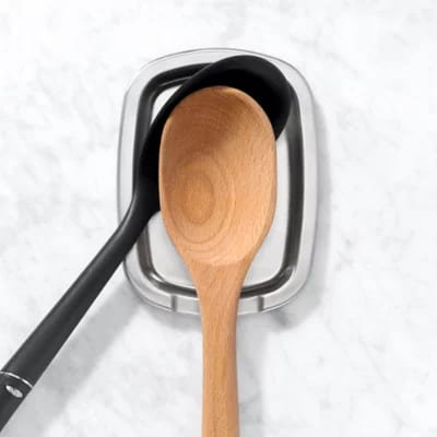 Portacucharas de acero inoxidable OXO Good Grips® protege tu barra de cocina, estufa o parrilla evitando que las cucharas calientes y llenas de comida las toquen con este artículo de OXO Good Grips. Úsalo verticalmente para un sólo utensilio de cocina, u horizontalmente para colocar varios. Por si fuera poco, este práctico portacucharas presenta una base de silicón que previene que se resbale para no rayar tus superficies, y que soporta el calor para mantenerlo frío al tacto.Protege tu cocina contra manchas de comida y utensilios de cocina calientesSe puede usar vertical u horizontalmenteDiseño elegante y modernoBase antideslizante de silicónHecho de acero inoxidableMedidas: 13.97 cm de largo, 10.92 cm de ancho y 2.15 cm de altoPeso: 122.47 gUso seguro en lavavajillasDe importación