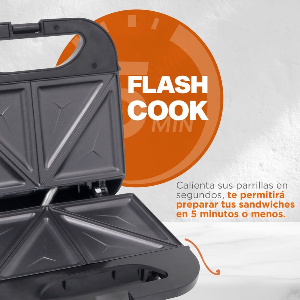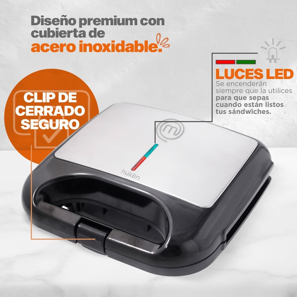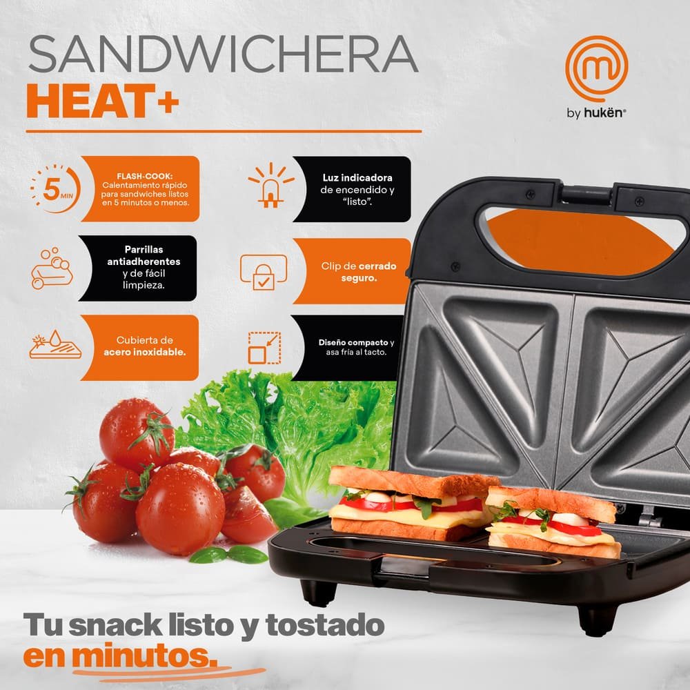 Sandwichera MasterChef® by Huken® no hay nada más delicioso que un sándwich crujiente y calientito, especialmente si es hecho en casa. Por eso, MasterChef trae para ti la nueva sandwichera HEAT+, creada con tecnología Flash Cook que te ayudará a obtener resultados perfectos y exquisitos en cinco minutos o menos. Cuenta con parrillas antiadherentes de alto nivel que facilitan mucho la limpieza; además, tiene un hermoso acabado de acero inoxidable que lo hace lucir increíble en cualquier espacio.Obtendrás sándwiches perfectos en cuestión de minutosPuedes preparar dos piezas al mismo tiempoAcero/plásticoLuz indicadora de “encendido” y “listo”Clip de cerrado seguroHace los sándwiches en 5 minutos o menosDiseño compactoAsas frías al tactoParrillas antiadherentes de alto nivel y fácil limpiezaCubierta de acero inoxidableTemperatura automática y exacta para resultados perfectosProducto de uso domésticoLeer manual de usuario antes de usarNo debe sumergirse en aguaLimpiar con un paño húmedo una vez fríoPeso: 1.1 kgMedidas: 22.5 cm de ancho, 21.7 cm de largo y 8.6 cm de alto750 WattsModelo: MK-SM-2SS
