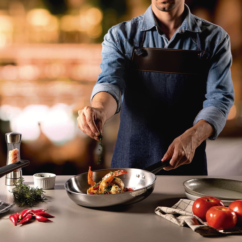 Sartén de acero inoxidable Tramontina® no hay nada como disfrutar de un platillo casero y para prepararlo a la perfección, es indispensable contar con un sartén resistente que te haga sentir como todo un profesional. Este sartén está hecho con tres capas de acero inoxidable y aluminio que distribuyen el calor de manera uniforme para que tus alimentos queden perfectamente cocidos en menos tiempo. Para una mayor seguridad de uso, cuenta con un mango de baquelita con protector de llamas que no se calienta ni se prende en fuego en caso de que la llama esté descentralizada. Finalmente, puede usarse en todo tipo de estufas ya sean eléctricas, a gas, de inducción o vitrocerámicas. Úsalo para preparar tus recetas favoritas y disfruta de su gran calidad desde el primer uso.Acero inoxidable y aluminioMango de baquelitaDistribuye el calor de manera uniformeCocción más rápidaNo necesitas cocinar a fuego altoTerminación de alto brilloApto para estufa de inducción, eléctrica, de vitrocerámica, resistencias eléctricas y de gasCuando se utilice el sartén en cocinas a gas, la llama no debe exceder la baseSi se usa una chapa eléctrica, la chapa debe tener el mismo diámetro que el sartén o diámetro menorSiempre disuelva la sal en agua hirviendo o con los alimentos, mezclando los ingredientes al inicio de la cocciónNo caliente alimentos poniendo un sartén del mismo diámetro sobre el otro. Ese procedimiento es peligroso, porque crea vacío e imposibilita su separaciónAlgunos alimentos que tienen almidón, como las pastas y el arroz, pueden dejar manchas en la parte interna del sartén durante la cocciónPara retirar fácilmente las manchas, pase un paño humedecido en jugo de limón o vinagre, o use la pasta de pulir acero inoxidable Tramontina30 cm de diámetro