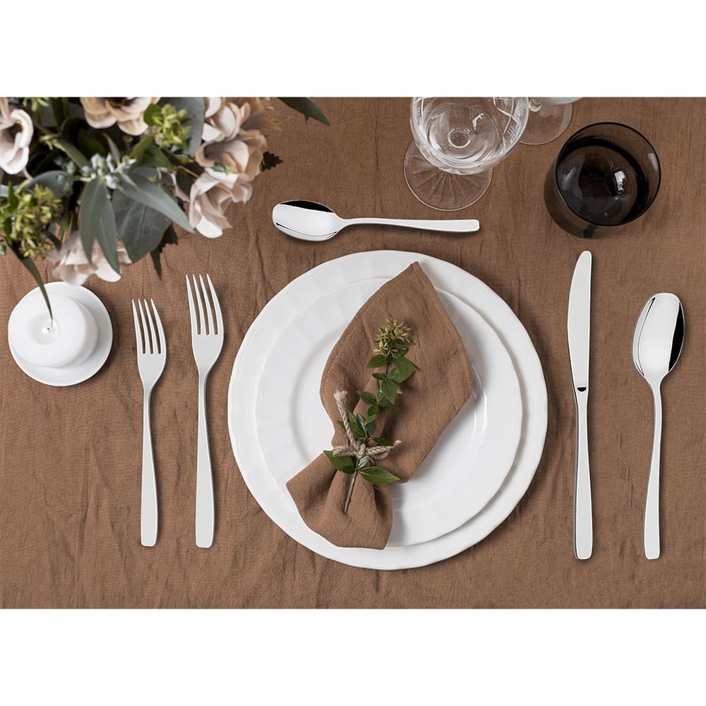 Set de cubiertos de acero inoxidable Tramontina®, disfruta de una comida completa con ellos. Cada pieza de este juego de cubertería está hecha de acero inoxidable, material de alta resistencia y durabilidad que permite conservar la forma, brillo y diseño original. Aquí podrás encontrar todo lo que necesitas para disfrutar una cena de principio a fin, especialmente cuando tienes invitados en casa, ya que tiene los cubiertos suficientes para 6 servicios. Utilízalos en cualquier ocasión, su acabado brillante los hace ideales para comidas con un tono más formal e incluso en familia.Juego de cubiertos de acero inoxidable30 piezasServicios para 6 personasIncluye:6 cucharas6 tenedores6 cuchillos6 cucharas para té6 tenedores para postreCucharas de cuenco simétrico y bordes cuidadosamente redondeadosTenedores de dientes pulidos hechos a la medida y forma de la boca para brindar la mayor comodidadCuchillos templados con filo duradero y resistentes a la corrosiónAcabado brillanteIdeal para el uso cotidianoApto para lavavajillasCuidados:Lavar con jabón, agua y esponja suaveNo utilizar fibras, ya que pueden dañar el acabado brillanteEnjuagar bien cada pieza no dejando rastros de productos abrasivos, estos pueden dañar el acero inoxidableLavar con agua caliente siempre que sea posible, esto conservará el brilloEnjuagar y secar inmediatamente para evitar que el cloro del agua manche el metalNo rozar los cubiertos unos con otros cuando se laven o guardenEvitar el contacto con superficies calientes para que no se decolorenNo guardar en lugares húmedosSe recomienda retirar los cubiertos del lavavajillas cuando termine el ciclo de enjuague para secarlos a manoAcero inoxidable