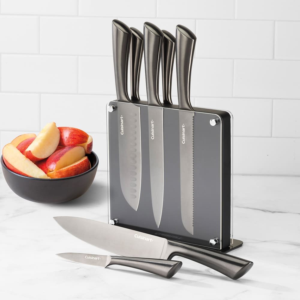 Set de cuchillos Cuisinart® calidad profesional al alcance de tu mano. Este set de cuchillos se compone de siete piezas excepcionalmente afiladas fabricadas con acero inoxidable alto en carbono que garantiza cortes precisos en cada uso; además, todos los cuchillos cuentan con mangos resistentes de fácil agarre para un desempeño digno de los chefs más experimentados. Por otro lado, el set incluye bloque magnético con cubiertas acrílicas que no solo sirve para almacenar tus cuchillos de manera segura, sino que también le dará a tu cocina una apariencia lujosa. Lo mejor de todo es que cada cuchillo ha sido diseñado cuidadosamente para un fin específico, por lo que no tendrás que seguir usando uno solo para preparar cada platillo. Úsalos para preparar tus mejore recetas y consiente a tu paladar con Cuisinart.Gran desempeño y durabilidadBloque magnético con cubiertas de acrílicoIncluye:1 cuchillo de chef de 20.32 cm1 cuchillo para rebanar de 20.32 cm1 cuchillo para pan de 17.78 cm1 cuchillo Santoku1 cuchillo serrado utilitario de 13.97 cm1 cuchillo para pelar de 8.89 cm1 cuchillo pelador1 bloque magnéticoMango resistente y cómodoPara distintos tipos de corteApariencia lujosaExcepcionalmente afiladosCalidad profesionalAcero inoxidable alto en carbonoGarantiza cortes precisosUso seguro en lavavajillasLavar a manoPara más información, leer instructivoPeso: 3.97 kg