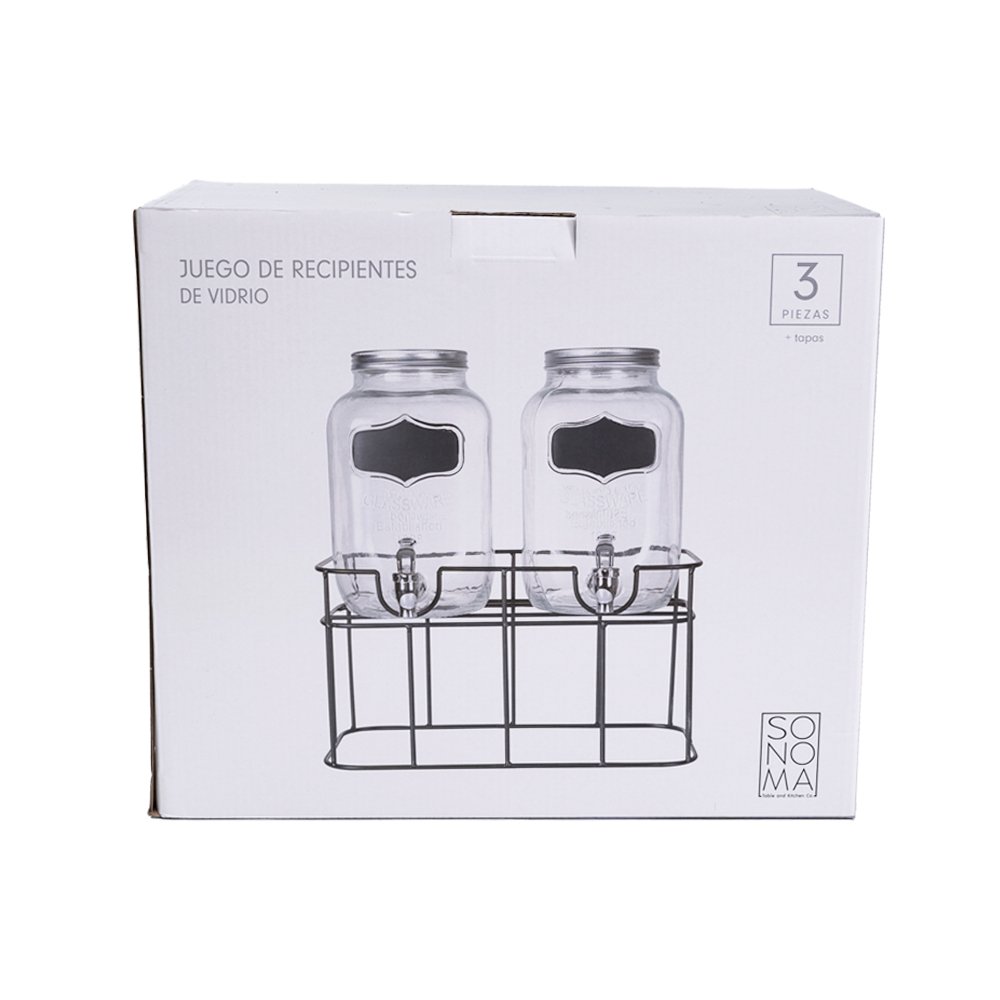 Set de dispensadores de bebidas de vidrio Sonoma® es todo lo que necesitabas para poder tener un toque único en tus reuniones familiares o con amigos. Este diseño cuenta con dos vitroleros con una base para poder disfrutar sabores distintos de aguas, té helado, jugos y más bebidas frías. Estos dispensadores son perfectos para poder convertirte en el mejor anfitrión con solo un kit que, sin duda alguna, hará la diferencia en cada reunión. Sonoma® cuenta con una gran variedad de productos para tu mesa para todo tipo de ocasión y gustos (de venta por separado).Vidrio3 piezasCada dispensador tiene una capacidad de 4 LLavar a manoIncluye base de metalLavar antes de usarProducto frágilNo tirar ni golpear