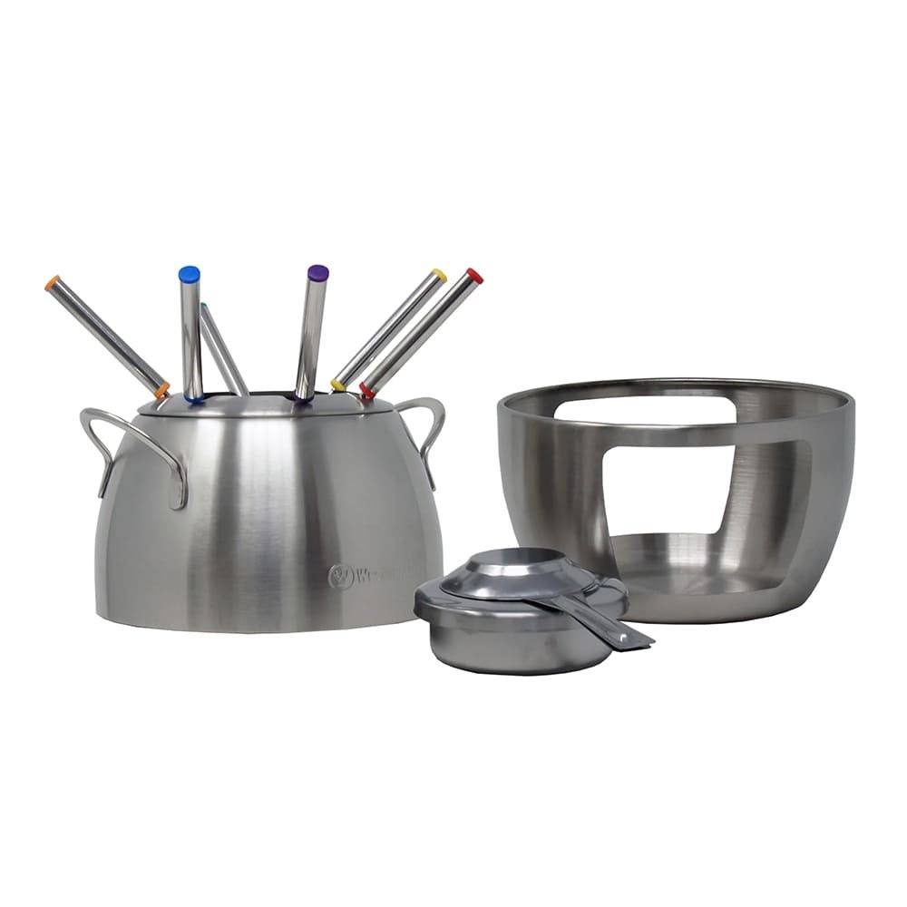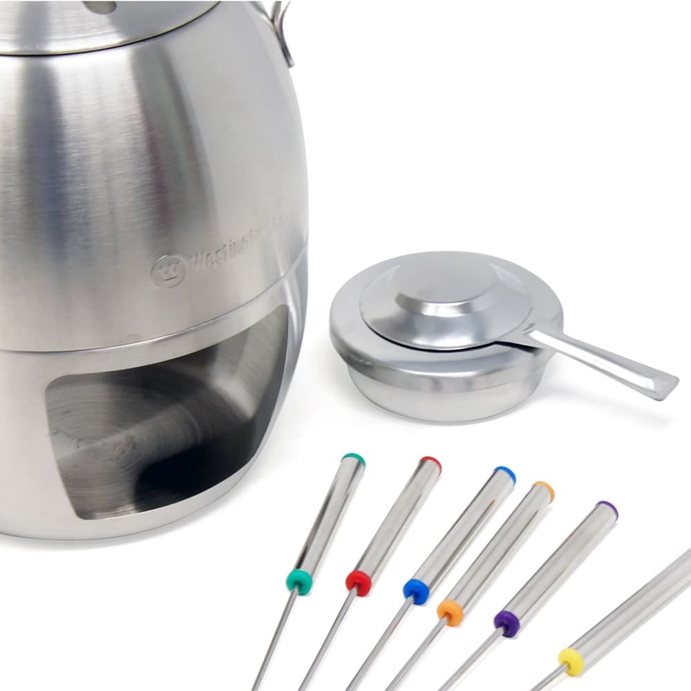 Set para fondue Westinghouse® es ideal si quieres sorprender a tus invitados durante las reuniones. Puedes derretir tu chocolate o queso favorito y disfrutar sumergiendo todo tipo de alimentos, desde fresas para el chocolate hasta pedazos de carne para el queso, ¡las posibilidades son infinitas! Lo mejor de todo es que no deberás preocuparte por la limpieza ya que sus materiales no retienen grasas ni aceites y evitan que los alimentos se peguen. Ideal para hacer tus reuniones aún más especiales Incluye: 6 tenedores con marcas de color 1 olla con capacidad de 2 L 1 base para tenedores 1 base para quemador 1 quemador de combustible con tapa desarmable 1 apagavelas ajustable Resiste altas temperaturas Acero inoxidable Fácil de limpiar Lavar a mano y secar con un paño No usar fibras de metal o detergentes abrasivos No retiene grasas ni aceites Medidas: 19.5 cm de ancho, 19.5 cm de largo, 22.5 cm de alto y 20 cm de profundidad