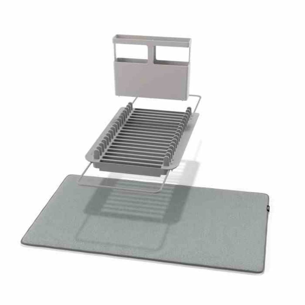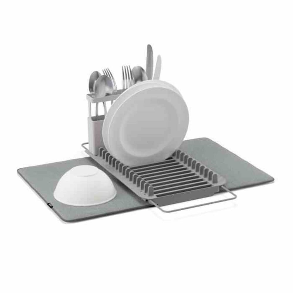 Tapete escurridor de plástico Umbra™ una solución innovadora para secar la vajilla de forma sencilla y sin ocupar demasiado espacio. Hecho de plástico duradero, este moderno tapete de microfibra absorbe el exceso de agua que queda en tus platos después de lavarlos a la vez que protege la superficie de la cocina de rayones y manchas de humedad. A diferencia de los escurridores comunes no estorba junto al fregadero y, cuando no está en uso, puede doblarse por completo para un almacenamiento más sencillo. Por otro lado, incluye una pieza con divisiones para que puedas acomodar los platos de forma vertical con el fin de conseguir un secado más rápido y eficiente. Úsalo para reemplazar ese escurridor gigante que solo quita espacio en la cocina y déjate sorprender por su increíble calidad desde el primer uso.Diseño innovador y compactoColor carbónIdeal para hogares pequeñosPerfecto para secar copas y otras piezas de cristaleríaCon espacios para acomodar los platosPuede doblarse cuando no está en uso50% plástico ABS/40% poliéster/8% acero inoxidable/2% siliconaBrazos extensibles que permiten colocarlo sobre el fregaderoCon 16 ranurasLibre de BPALiviano y discretoAbsorbe por completo el agua restanteEvita que el agua ensucie tu encimeraLavar a máquinaEl escurridor se puede lavar en lavavajillasMedidas: 56.85 cm de ancho, 50.8 cm de largo y 16.84 cm de alto